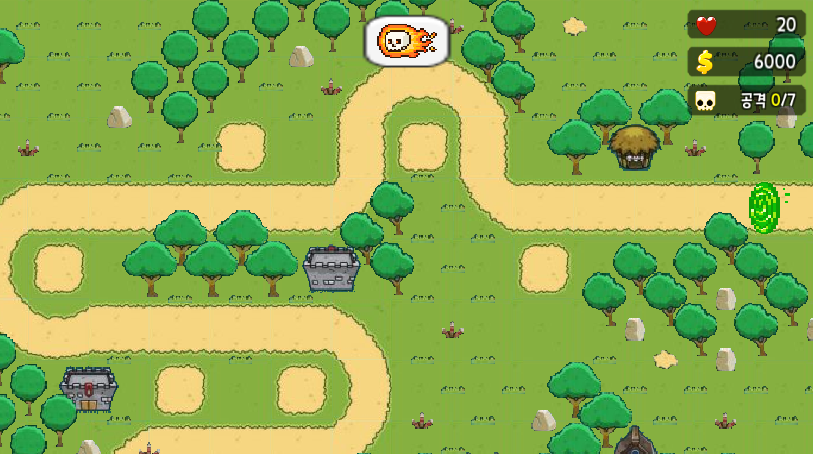 일단, 상단 오른쪽 위에 생명력, 돈, 몬스터 웨이브 수 가 UI로 나와있습니다.