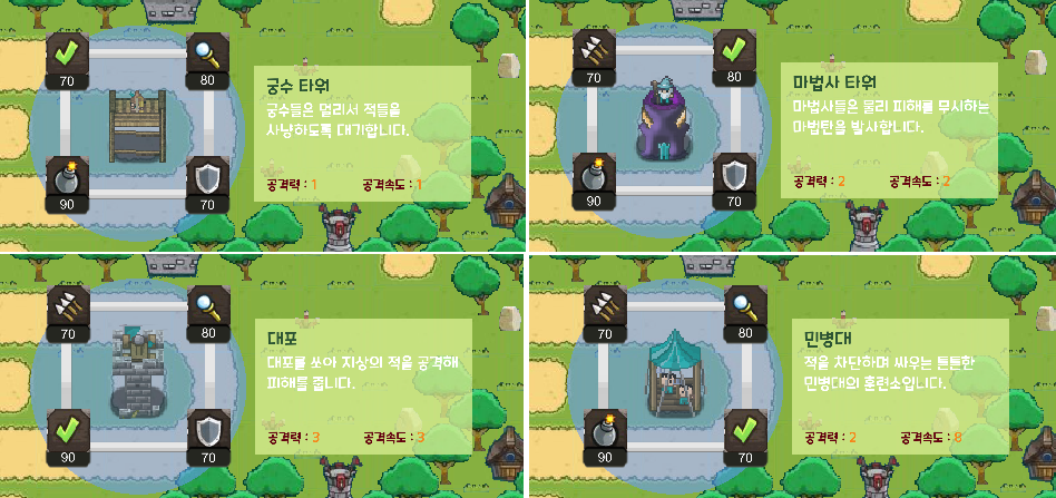 타워 종류는 궁수 타워(70원), 마법사 타워(80원), 대포(90원), 민병대(70원)가 있습니다.
