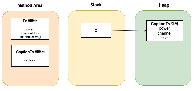 5. 스택에 있는 참조변수 c는 대입 연산자(=)를 통해 힙에 생성된 CaptionTv 객체의 주소를 담고 있다.