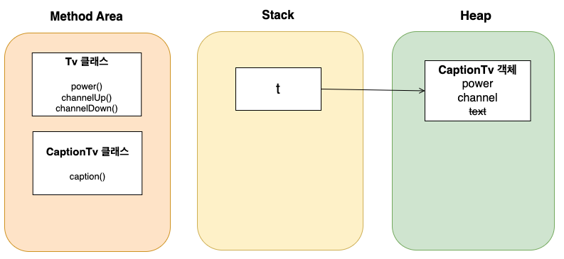 위의 예시에서는 CaptionTv의 text와 caption()은 사용할 수 없다.(자식 클래스에서 추가로 정의된 멤버)