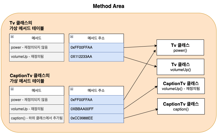 위 그림에서 보듯 재정의된 volumeUp() 메서드는 서로 다른 메서드 주소를 가지게 되고,