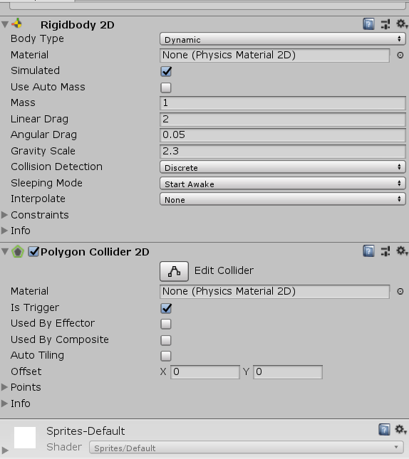 플레이어에게 물리적 요소를 추가하기 위해 Rigidbody2D와 Polygon Collider2D 컴포넌트를 넣어줍니다.