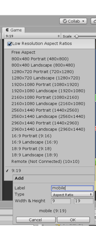 그리고 Game의 화면 비율에서 모바일 버젼을 임의로 추가합니다.