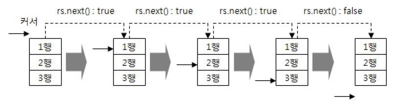 boolean next( ) 메소드는 커서 다음에 레코드가 있는지 판단하여 없으면 false, 있으면 true를 반환한 다음에 커서를 다음 레코드로 이동 시킵니다.