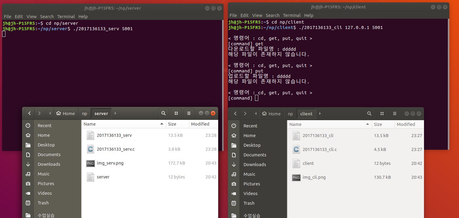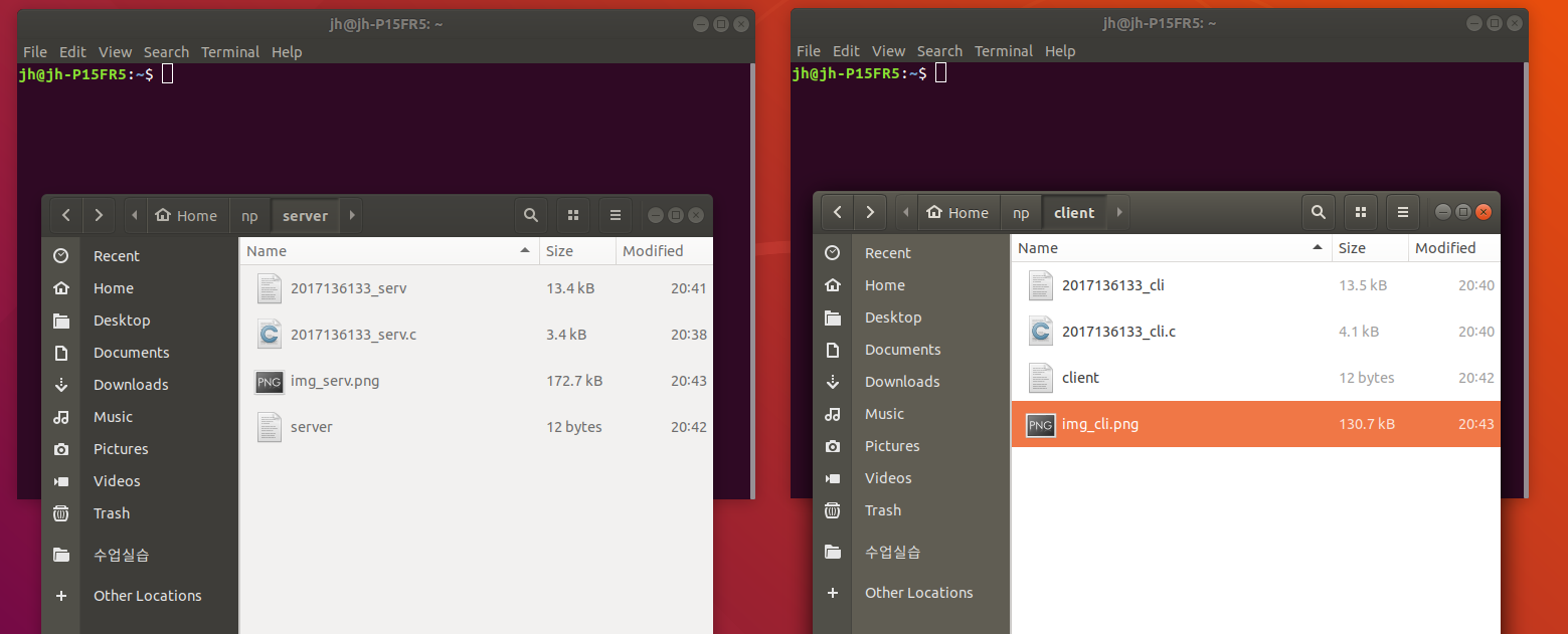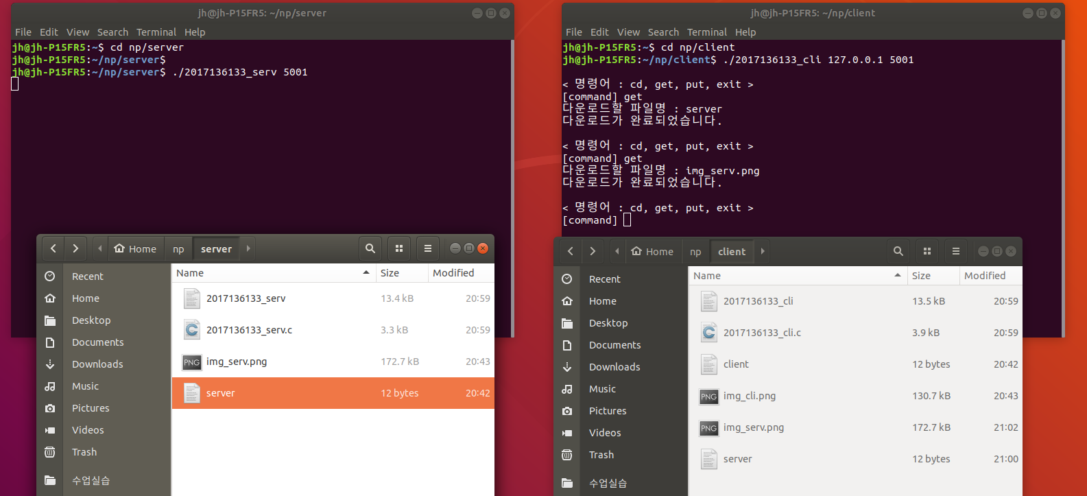 --> 일단, 서버를 위한 터미널 창 1개(왼쪽), 클라이언트를 위한 터미널 창 1개(오른쪽)를 띄운다. 서버 관련 파일들의 폴더는 np/server에 있고, 클라이언트 관련 파일들의 폴더는 np/client에 있다. 폴더 두 개도 띄워서 동시에 확인하도록 했다. 서버 폴더에는 c파일, 실행파일, img_serv.png와 server라는 텍스트 파일이 있다. 클라이언트 폴더에는 c파일, 실행파일, img_cli.png와 client라는 텍스트 파일이 있다.