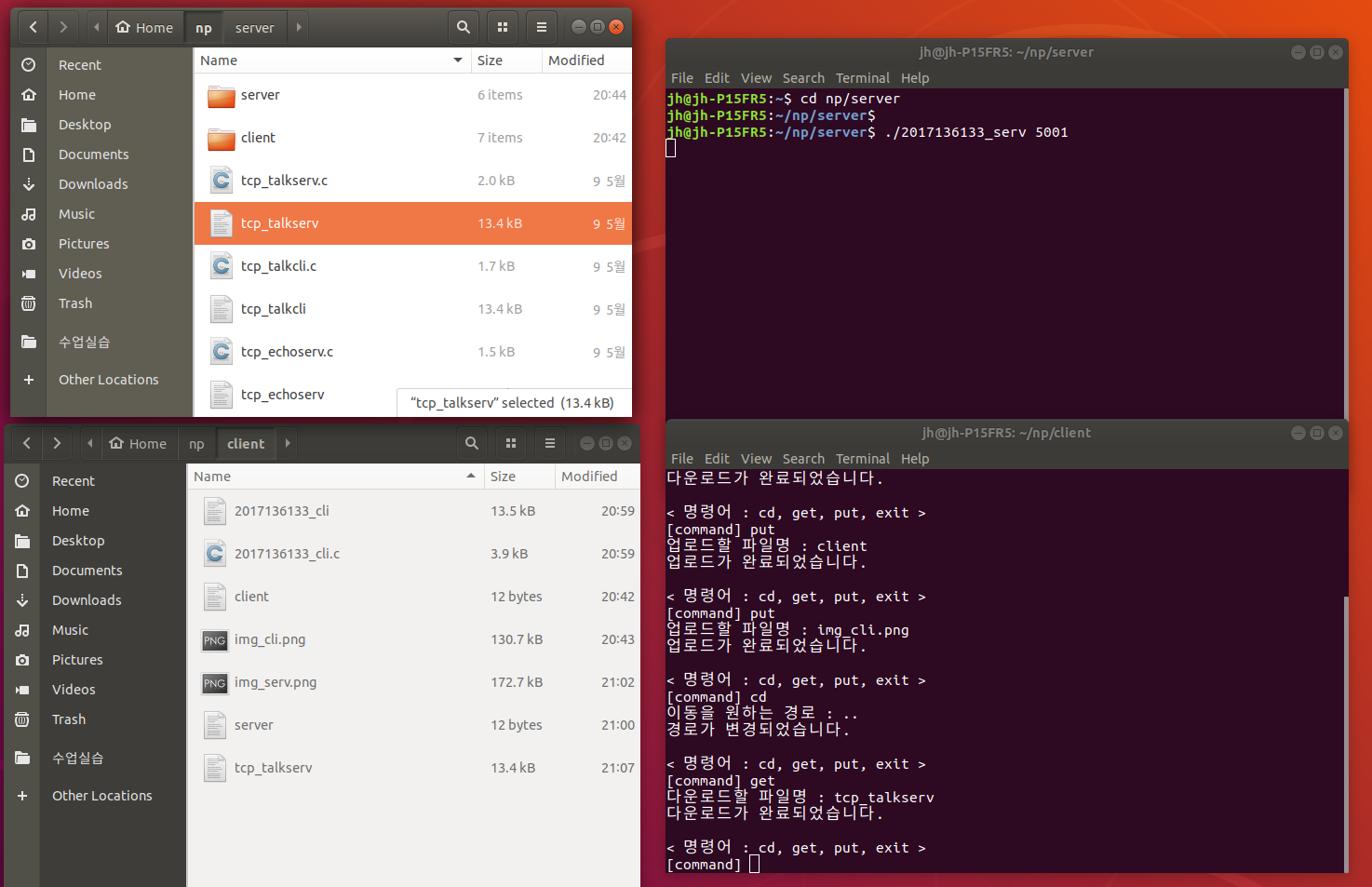 --> 다음에 이동된 np 폴더에서 파일을 다운받기 위해 get 명령어를 실행해보았다. np 폴더의 tcp_talkserv 실행파일을 다운로드 해보겠다. 파일명을 입력하고 앞서 말한 get 동작 과정을 통해 np/client 폴더에 성공적으로 다운로드 된 것을 볼 수 있다. 성공적으로 다운로드 되어 클라이언트 터미널 화면에 다운로드가 왼료되었습니다 문구가 출력되었다. 어떤 종류의 파일이든 잘 동작하는 것을 볼 수 있다. 이렇게 cd 명령어로 현재 디렉토리를 변경해가면서 다운로드 할 수 있기 때문에 전체 디렉토리를 대상으로 가능하다.