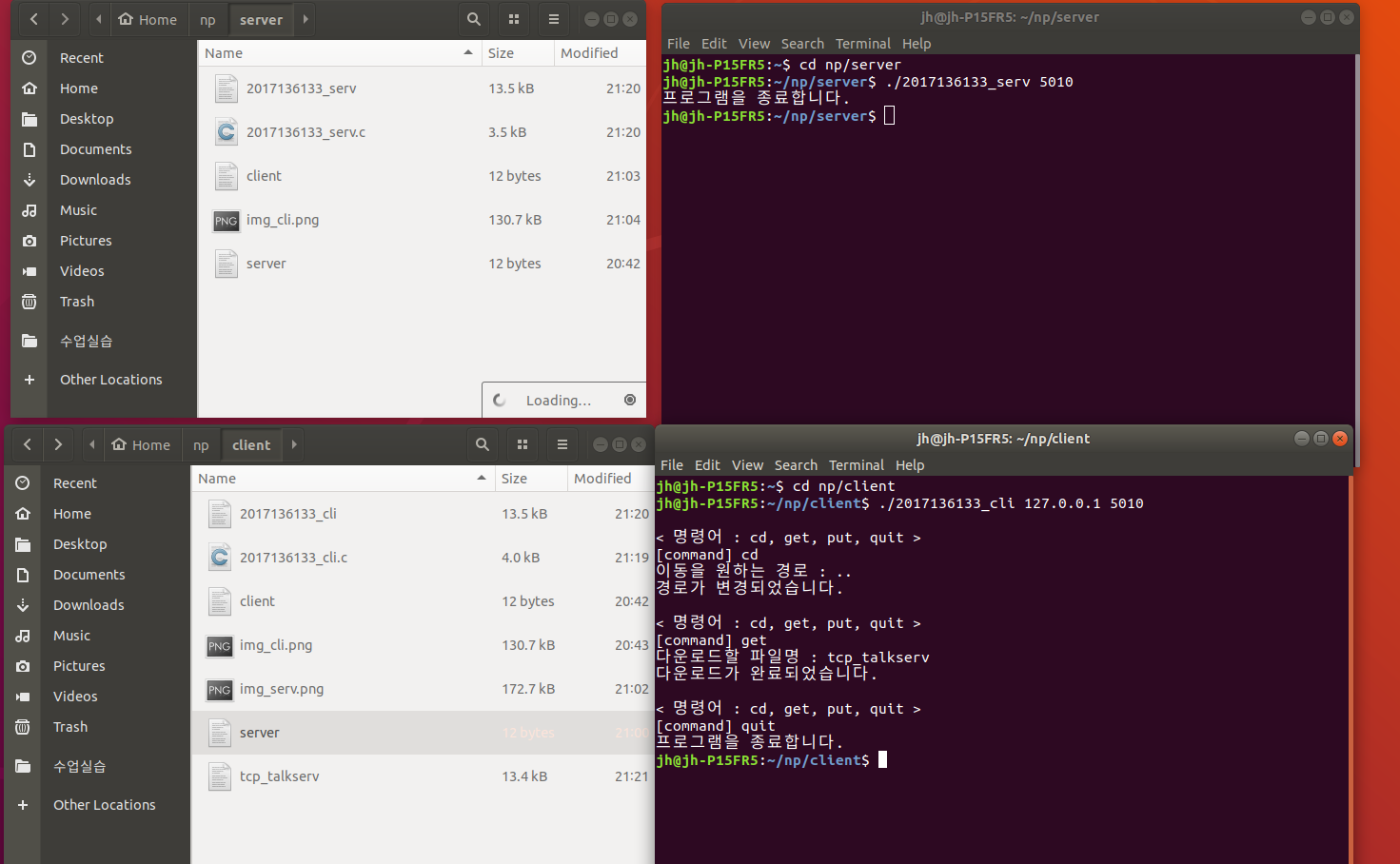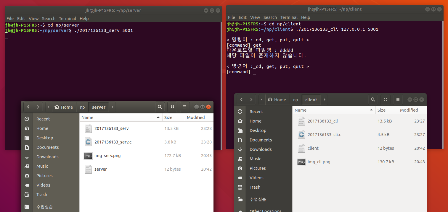 --> 이번에는 put 명령어(업로드)를 실행해보았다. put 명령어를 입력하면 업로드할 파일명을 입력하라고 한다. np/client폴더의 client 텍스트 파일을 서버 폴더에 업로드 해보겠다. 클라이언트는 입력받은 파일명을 fopen()의 rb모드(읽기 + 이진모드)로 실행하여 파일을 연다. 그 후에 서버에게 send()로 파일명을 전송한다. 서버는 recv()로 파일명을 수신하고 fopen()의 wb(쓰기 + 이진모드)를 실행한다. 그 다음, 클라이언트는 파일의 크기를 계산하여 send()하고 서버는 이를 recv()한다. 이 크기를 이용하여 클라이언트는 버퍼의 크기 256씩 fread()하여 send()한다. 서버는 클라이언트가 보내온 것을 recv()하고 fwrite()로 파일을 np/server 폴더에 저장한다. np/server 폴더에 client 텍스트 파일 업로드가 성공적으로 되었음을 볼 수 있다. 서버는 업로드 성공여부를 send()하고 클라이언트는 recv()하여 업로드가 완료되었습니다 문구를 출력한다.
