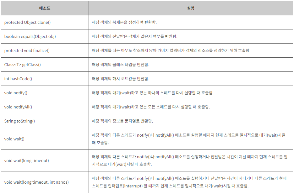 Object 클래스에서는 11개의 기본 메서드가 정의되어 있으며 내가 생성한 클래스에 자동으로 Object 클래스의 기본 메서드가 포함된다.