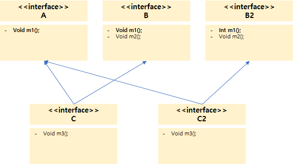 위의 구조에서 인터페이스 A와 B2를 상속받는 인터페이스 C2를 만들려고 할 때, 컴파일 에러가 발생한다.