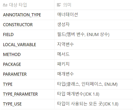 이 애노테이션을 적용할 때는 이 요소들의 값을 빠짐없이 지정해주어야한다.