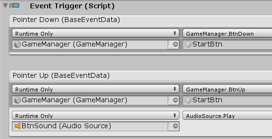 모든 버튼에 EventTrigger 컴포넌트를 추가하여 PointerDown과 PointerUp 이벤트에 함수를 적용했습니다.