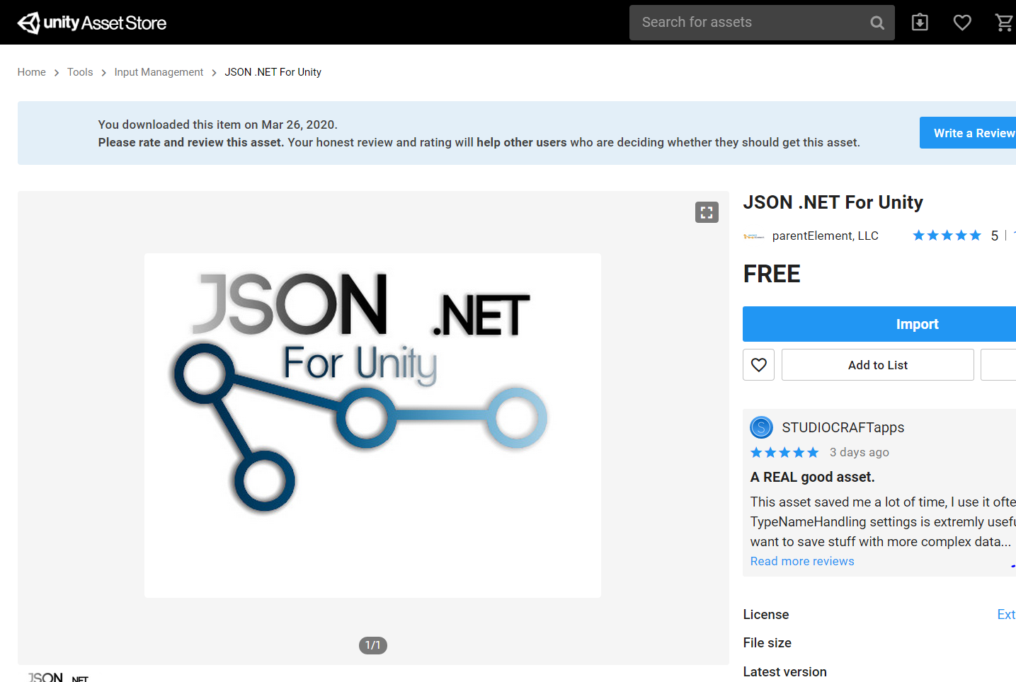 먼저, 에셋 스토어에서 JSON .NET For Unity를 다운받고 Import 합니다.