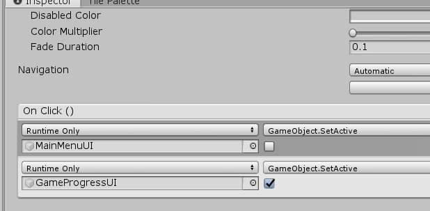 재생 버튼의 인스펙터 창에서 OnClick에 MainMenuUI와 GameProgressUI를 드로그앤드랍 합니다.