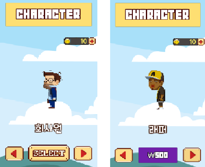 그리고 구매하지 못한 캐릭터는 선택 버튼 대신 가격과 함께 구매버튼이 나타나야합니다.