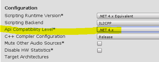Api Compatibility Level 를 .Net 4.x로 바꾸어야 합니다.